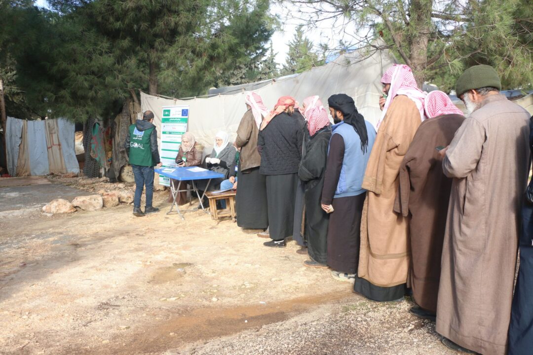 Cash distribution point in Ma’arrat Misrin countryside, where displaced families receive assistance under the EU-funded SANAD II programme.