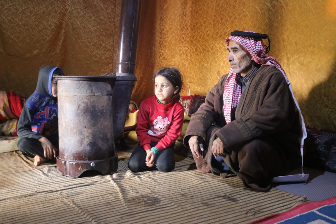 Mohammad sitting with his children inside their shelter in front of a heater in Al-Hawija Camp, Ma’arrat Misrin countryside, Idlib governorate.