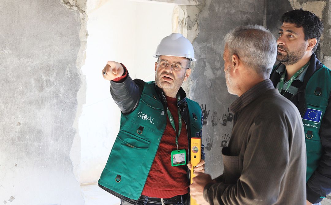 GOAL Rehabilitation Engineer Abdulhamid discusses the rehabilitation work with Abu Hussien inside his house, explaining the steps being taken to make the house safe, habitable, and resilient