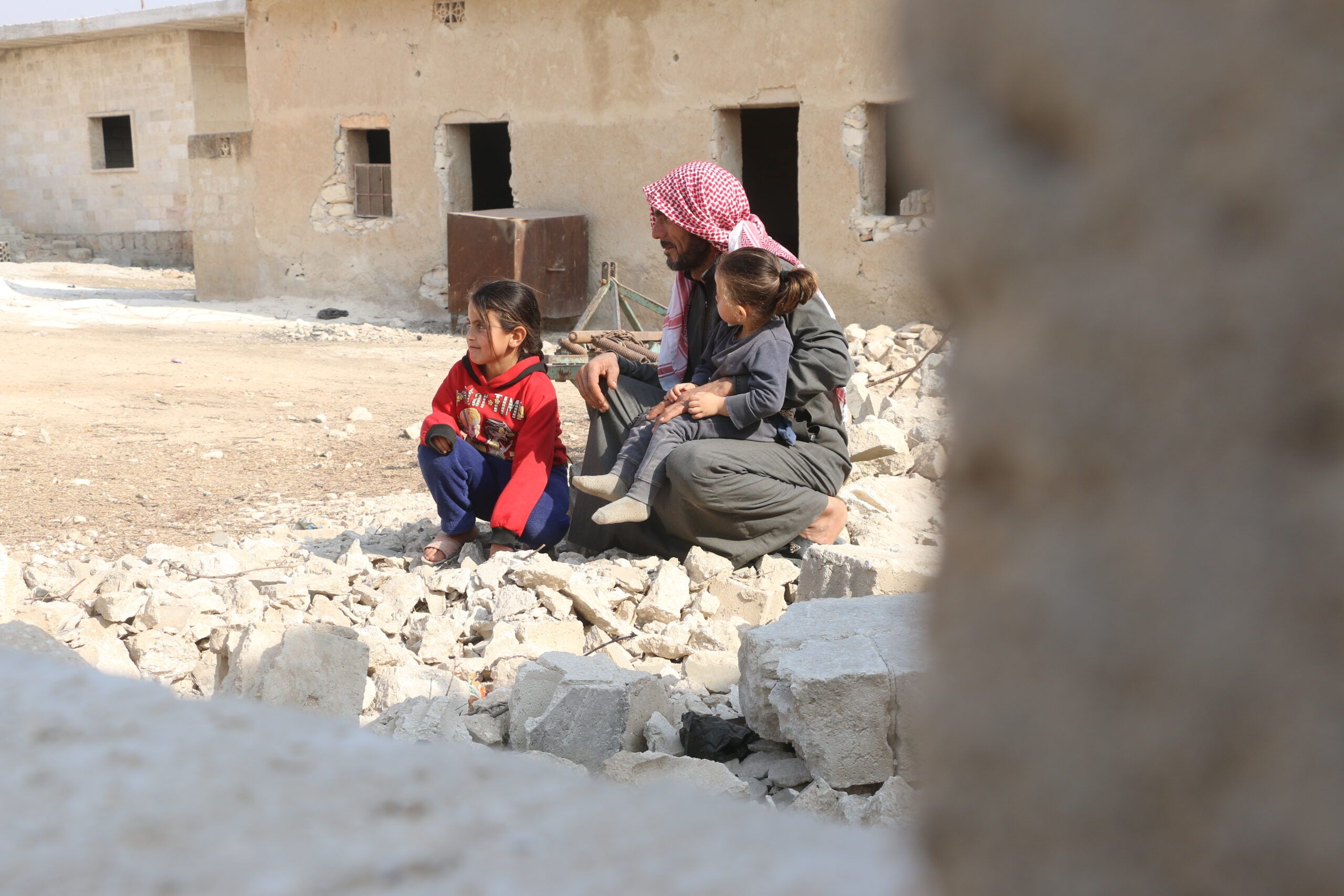 Ali and his granddaughters sit among the rubble of Baboulin village in Idlib governorate, where many homes and public structures were damaged during years of conflict. Families returning to the area continue to face challenging living conditions as they work to rebuild.