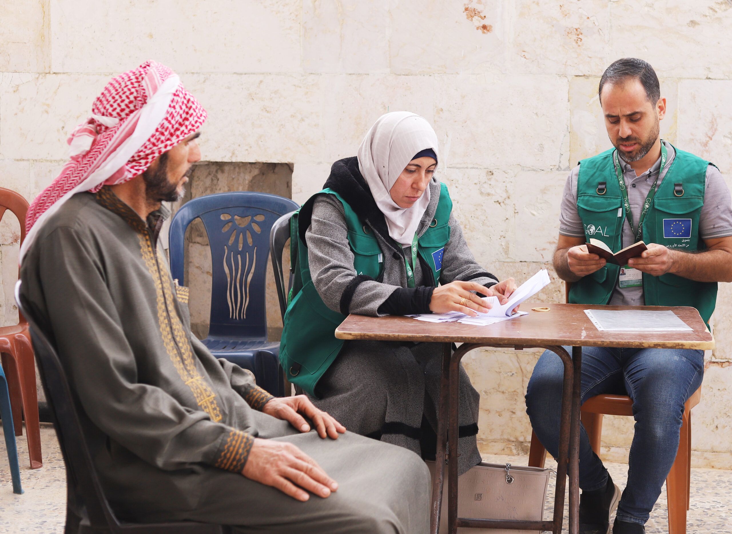GOAL’s cash distribution team, including Lama Sanoon, Cash & Voucher Assistance Team member, speaks with Ali during a cash distribution in Baboulin village, Idlib governorate.